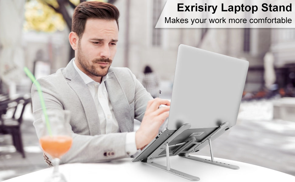 - 【Portable-Foldable-Stable Laptop Stand】The body of the Exrisiry laptop stand is made with Premium Aluminum Alloy instead of Cheap ABS or Plastic, the double triangle design, and large size silicone nonslip pad on both sides of the notebook stand made it more stable compares with the similar foldable laptop stand. also, The design of foldable, portable makes the laptop stand easier for you to carry out and convenient at work.