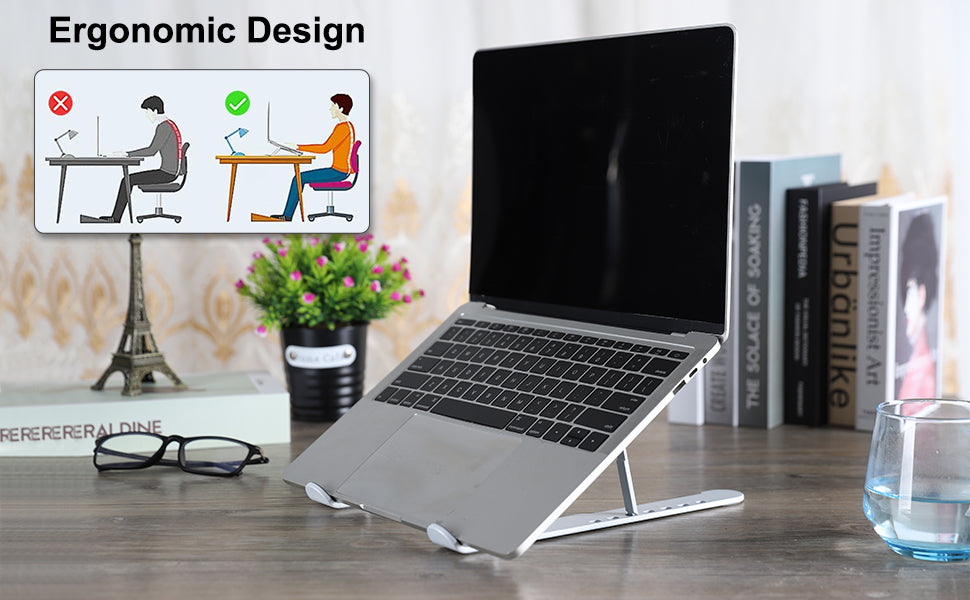 - 【Comfortable Ergonomic Design】A stand for the laptop with ergonomic design not only offer you a proper height and correct posture during work but also reduce the possibility of your neck, shoulder, and spine gets soreness when the working hours increase. Exrisiry aluminum computer stands with an ergonomic design that will change the way you work and make you physically comfortable.